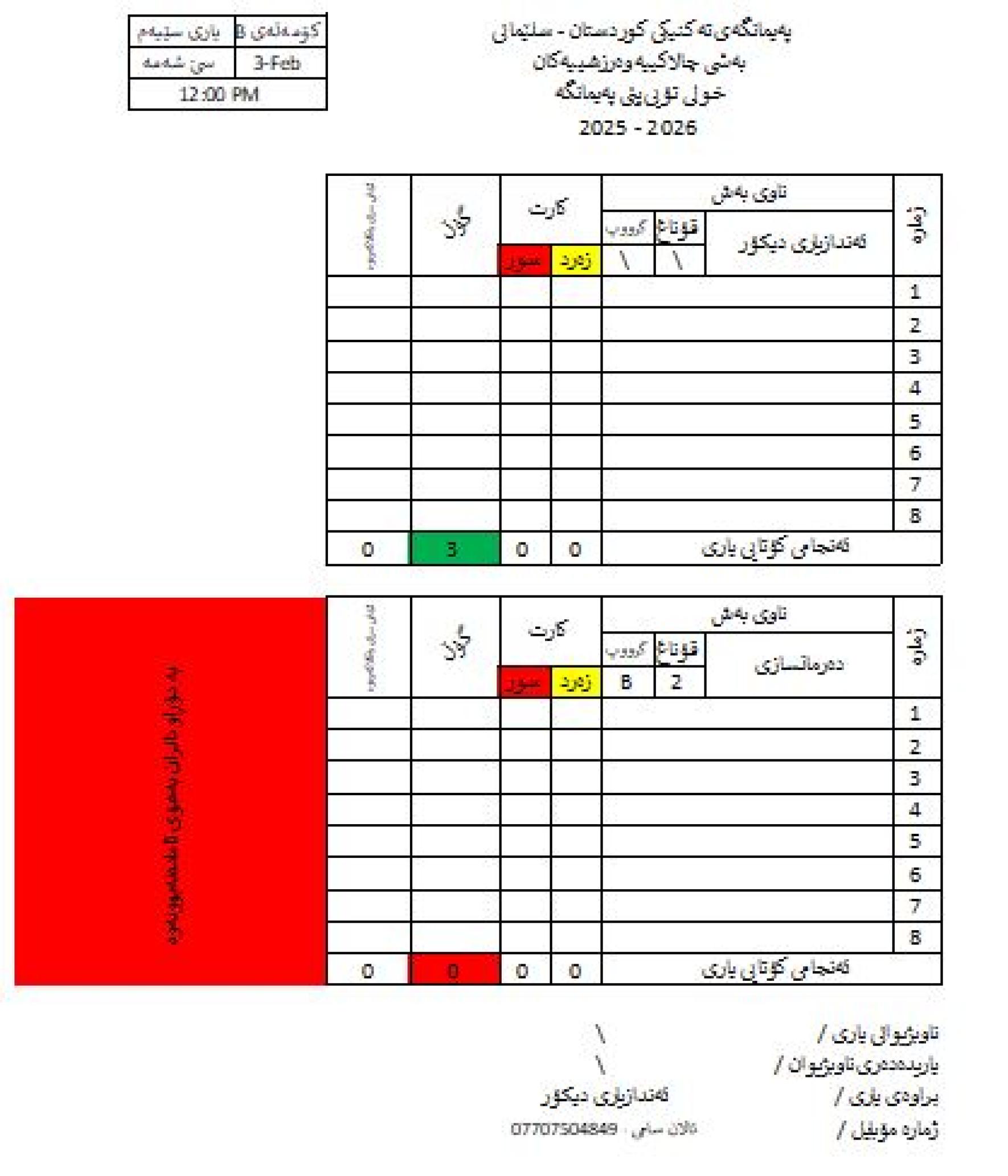 ڕۆژی سێ شەمە لە 03\02\2026 بەشی دوو تیپی بەشی دەرمانسازی و ئەندازیاری دیکۆر براوە بوون، ئەنامەکان بەم شیووازەی لای خوارەوە بوون: