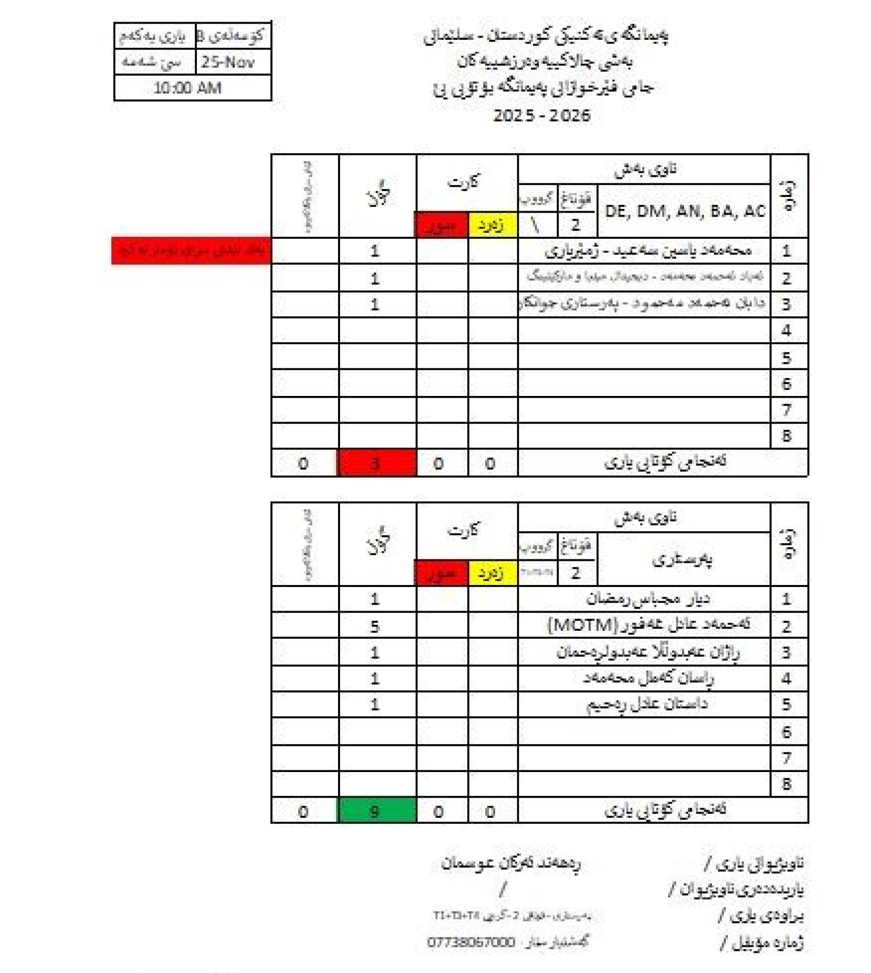 ئەمڕۆ لە جامی فێرخوازانی پەیمانگەدا بۆ تۆپی پێ، لە قۆناغی کۆمەڵەکاندا و لە کۆمەڵەی بی، یاری نێوان تیمی (پێنج بەشییەکە و پەرستاری - قۆناغی 2 - گروپی تی١، ٣، ٤) ئەنجام دراو، و پەرستاری بووە براوەی یارییەکە بە ئەنجامی (9 - 3)